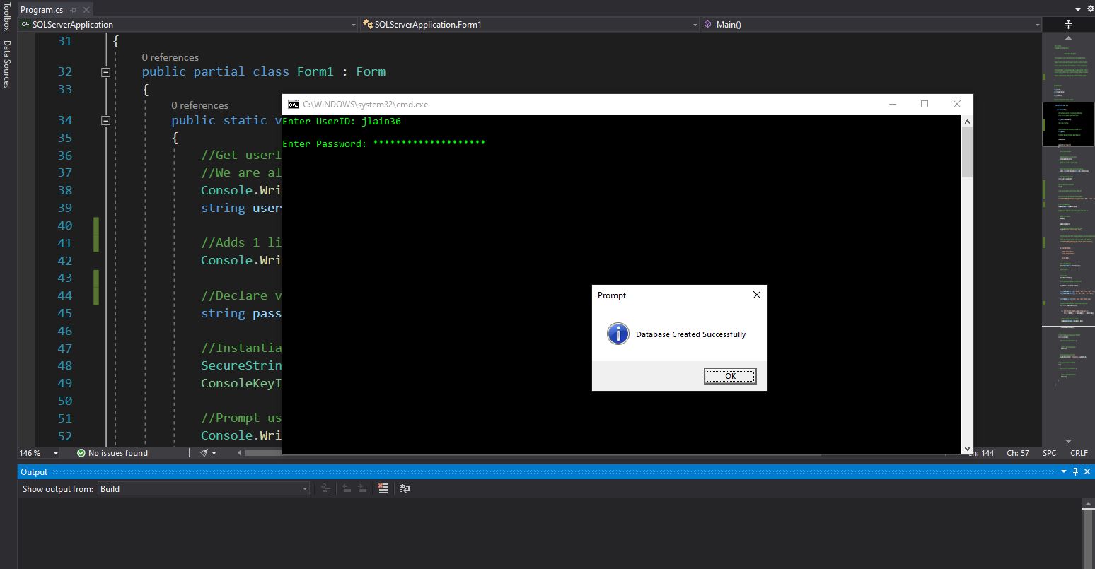 I decided to use the Microsoft SQL Server Management Suite because again, it is another tool and skill I can showcase to future employers. Seeing how this project was created from scratch, I added the features and functionality using my own creativity. My C# program first prompts the user to enter a username and password using secure authentication. When the password is typed the “*” character is displayed to the console rather than the actual password. The username and password are used to authenticate the MS SQL server session. If the username and/or password is incorrect, the program will throw a system level exception letting the user know the entered credentials were incorrect. The program will only continue if the correct credentials are authenticated.